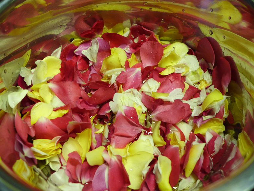 Blüten von ca. 15 Duftrosen vorsichtig waschen und trockentupfen, in ein Ansatzgefäß füllen, ca. 150 g weißen Kandiszucker und eine 1/2 Vanillestange zugeben und mit 0,7 Liter (1 Flasche) weißen Rum übergießen.