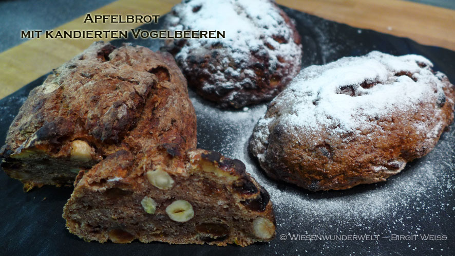 Seit ich im letzten Jahr im Kräuterpädagogenkurs das Kandieren der Vogelbeeren ausprobiert habe, sind die eine feste Zutat geworden – es geht aber auch mit Rosinen und anderem Trockenobst. Diesmal wurde es für mich sogar ein Jahresbrot mit vielen schönen Erinnerungen an 2017: Äpfel aus dem Garten, Vogelbeeren vom Feldweg, eine Handvoll getrocknete Pala-Birnen aus dem Herbsturlaub in Südtirol und Walnüssen und Trocken-Aprikosen aus Ungarn….