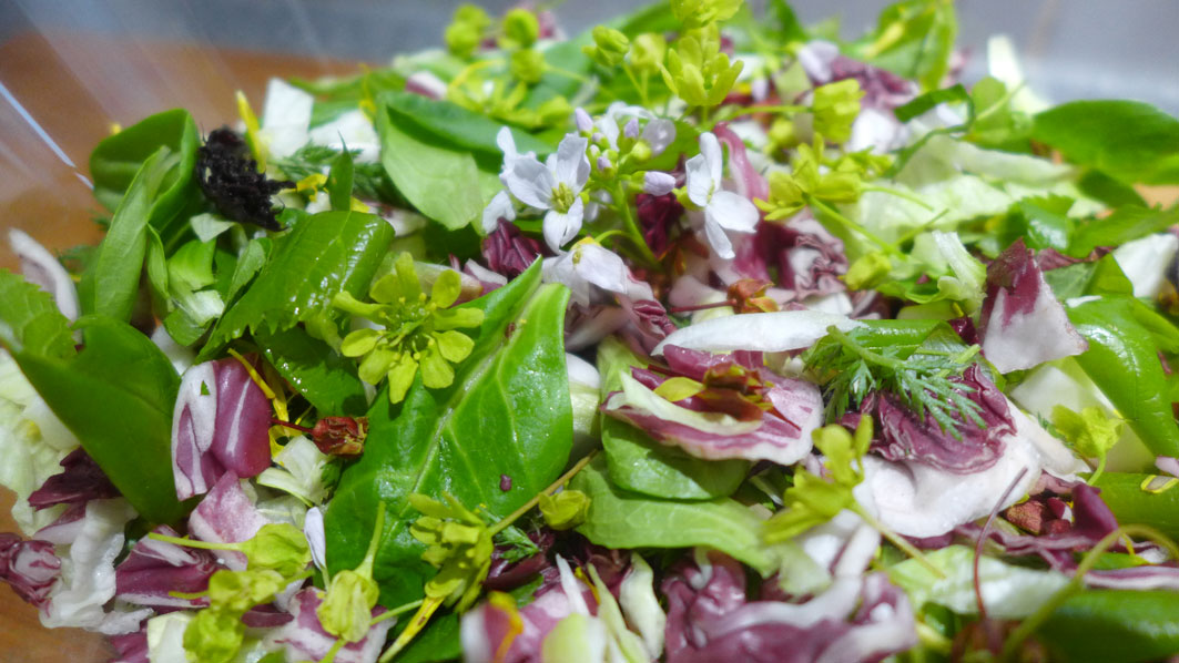 Eine Handvoll roten Radiccio, eine Handvoll Feldsalat (aus dem Gemüseladen), zwei Handvoll Lindenblätter, Blüten vom Spitzahorn und Blutspitzahorn, ein paar junge Löwenzahnblätter, ein paar Löwenzahnblüten (ausgezupft – bei Ursel Bühring hab ich gelernt das ist „Löwenzahnflitter“), Schafgarbeblättchen, etwas jungen Giersch und ein paar Blüten vom Wiesenschaumkraut.
