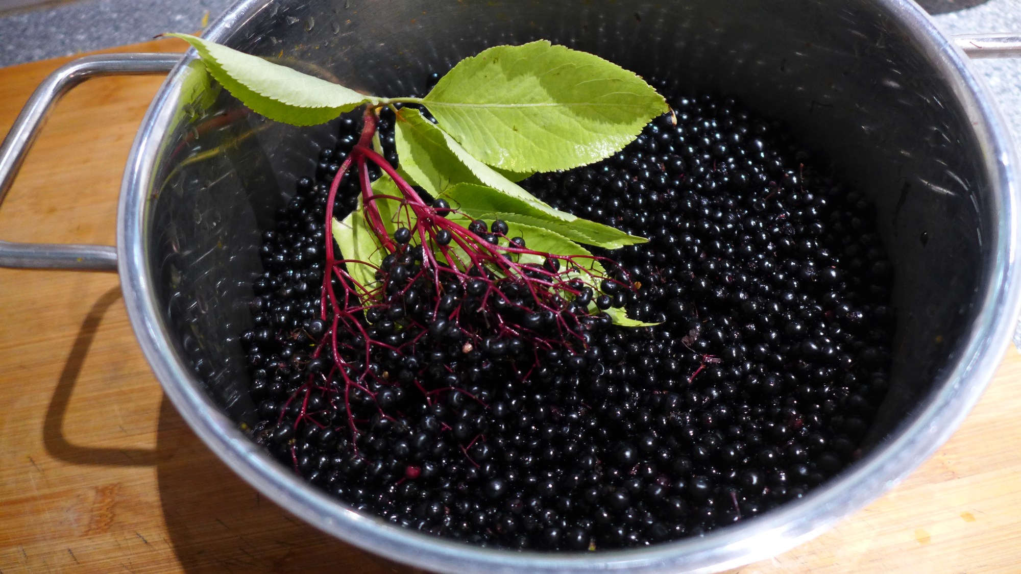 Beeren waschen und von den Dolden streifen (geht mit einer Gabel gut), in einem Topf geben. Aufkochen und ungefähr 20 Minuten köcheln lassen. Dann durch ein Sieb, welches mit einem Mulltuch ausgelegt ist, abgießen (unbedingt ein altes Tuch verwenden, die Flecken lösen sich nie mehr), nochmals erhitzen, heiß in sterilisierte Flaschen abfüllen und zur besseren Haltbarkeit 30 Minuten bei 90 Grad einkochen.