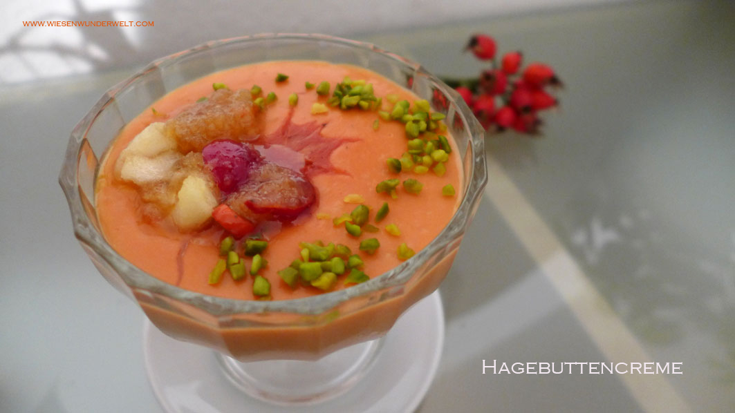 In Schüsselchen oder Gläser füllen und mit jeweils einem TL Hagebuttenmark, Nüssen, Mandeln oder Pistazien und / oder kandierten Apfel- und Hagebuttenstückchen verzieren.