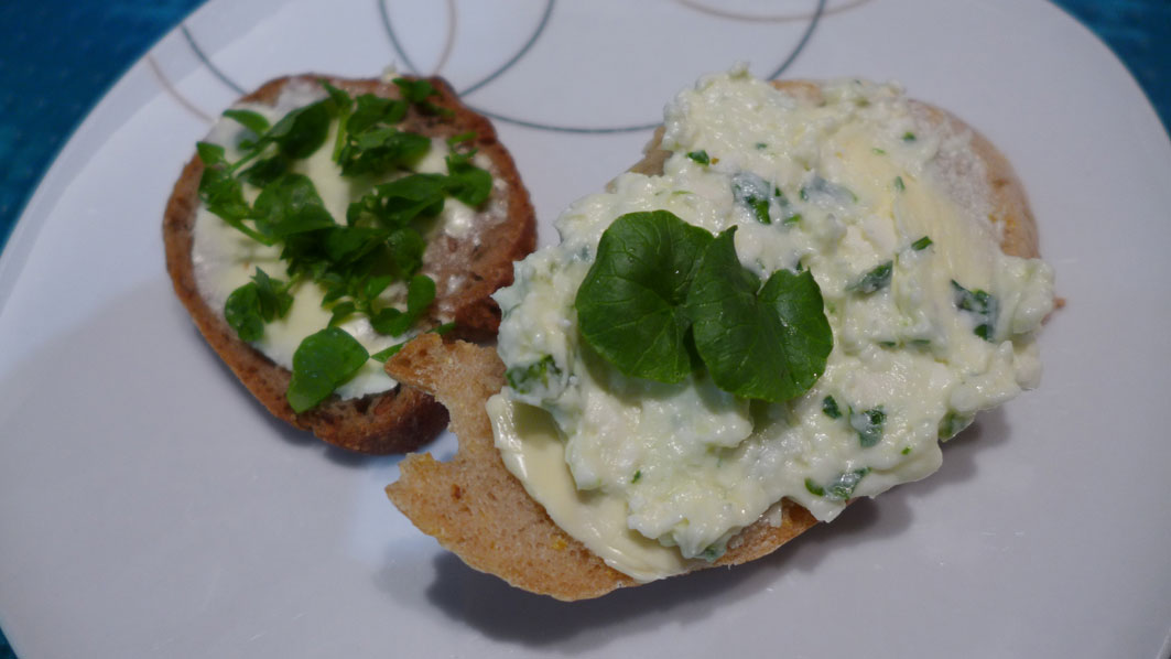 Frische Brunnenkresse esse ich am liebsten pur aufs Butterbrot, ein Teil wurde Bestandteil eines Salats und die Hälfte diese Tellers verarbeitet ich zu Brotaufstrich. Das geht recht schnell.