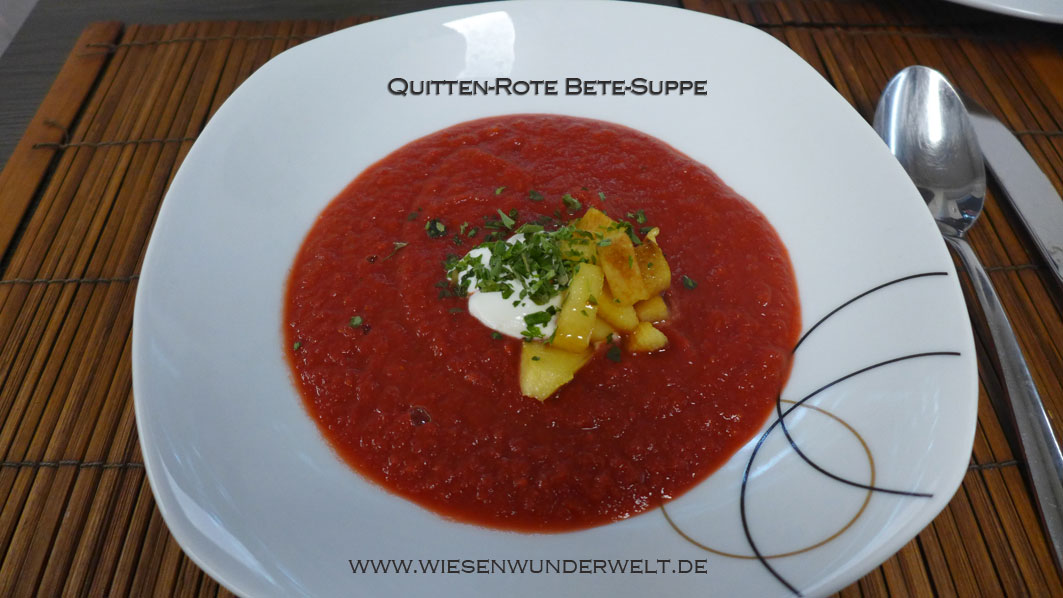 Am besten schmeckt die Suppe mit frischer Rote Bete und frischen Quitten.