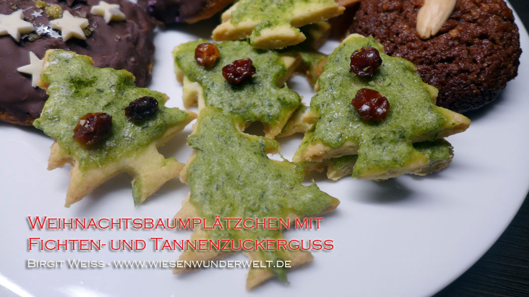 Einfache, wenig süße Mürbeteigkekse mit einem Guss aus Fichtennadeln und Zucker. Das musste ich einfach ausprobieren! Am Ende habe ich das Rezept etwas abgewandelt, es wurde durch Zitrone etwas fruchtiger und die Bäumchen bekamen noch Christbaumkugeln aus kandierten Vogelbeeren und teilweise Lichterketten aus Löwenzahnzucker.
