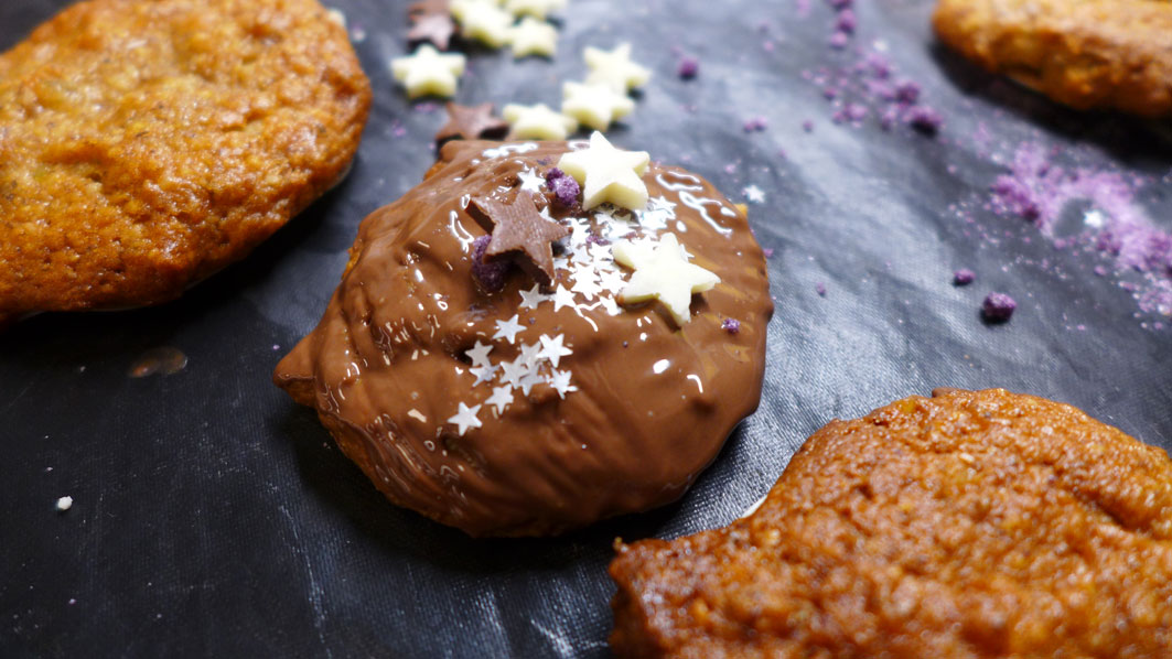 Alle Zutaten verrühren und mit einem Löffel auf Backoblaten geben. Bei 175 Grad Umluft 20 bis 25 Minuten backen. Nach dem Auskühlen mit Schokolade überziehen.