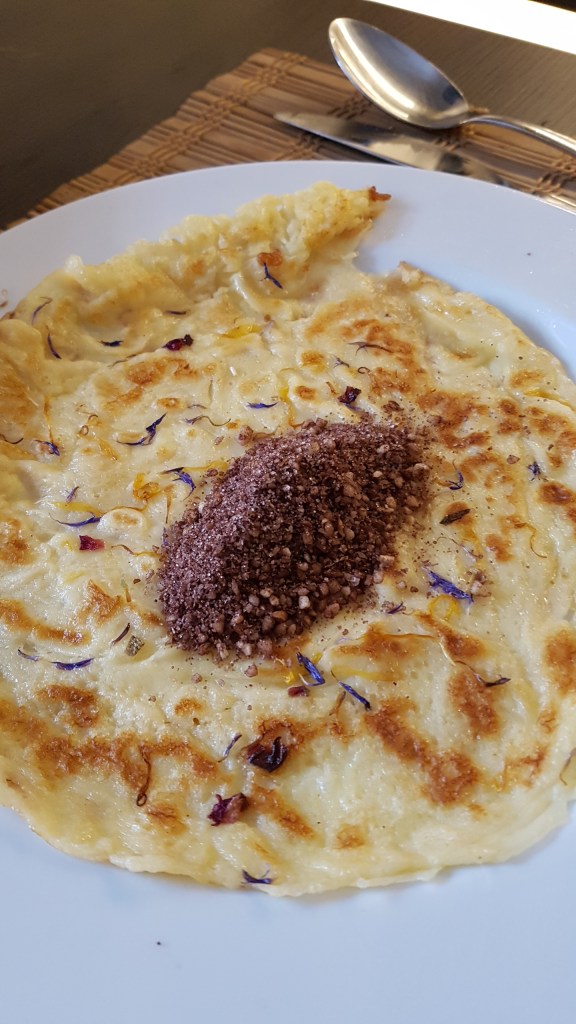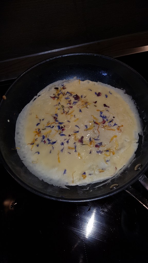 In eine Pfanne geben, gerade soviel, bis der Boden bedeckt ist und getrocknete Blüten auf die Masse streuen – ca. 2-3 Min. bei mittlerer Hitze auf jeder Seite braten.