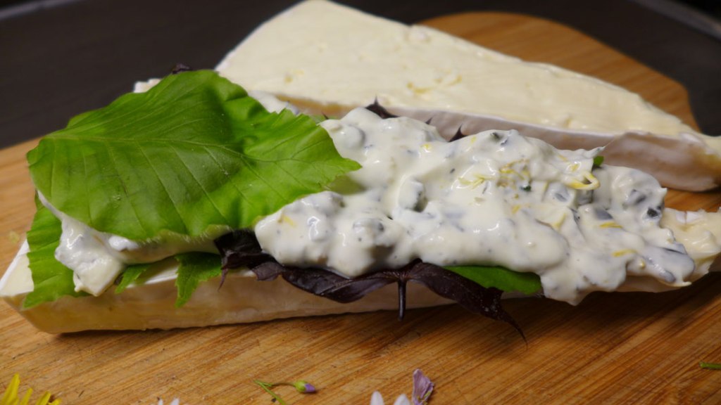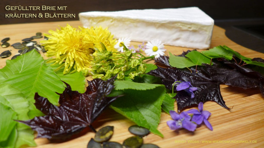Eine Handvoll gemischte Blätter von Linde, Buche, Birke, Kirsche, Blüten vom Spitzahorn und Löwenzahn, eine Ecke Brie oder einen Camembert, 1 EL gehackte Kürbiskerne oder Walnüsse, 100 g Frischkäse, 50 g Schmand, etwas Milch, Knoblauch nach Geschmack (oder fein gehackte Knoblauchsrauke), Frühlingszwiebel, Blüten und Kräuter zum Dekorieren