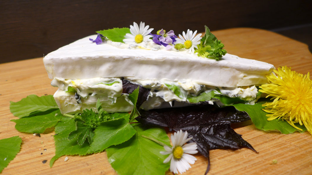 Eine Handvoll gemischte Blätter von Linde, Buche, Birke, Kirsche, Blüten vom Spitzahorn und Löwenzahn, eine Ecke Brie oder einen Camembert, 1 EL gehackte Kürbiskerne oder Walnüsse, 100 g Frischkäse, 50 g Schmand, etwas Milch, Knoblauch nach Geschmack (oder fein gehackte Knoblauchsrauke), Frühlingszwiebel, Blüten und Kräuter zum Dekorieren